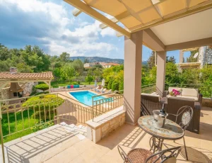 The villa is fully equipped and tastefully furnished, offering comfortable living space over three levels. The ground floor includes a cozy living and dining area, an open-plan kitchen and a guest WC. The first floor features two air-conditioned bedrooms with balconies and one bathroom. The lower level, with its own private entrance, offers a double bed and a single bed, a seating area, billiards and a bathroom, providing added privacy.