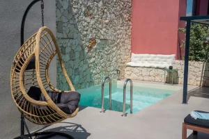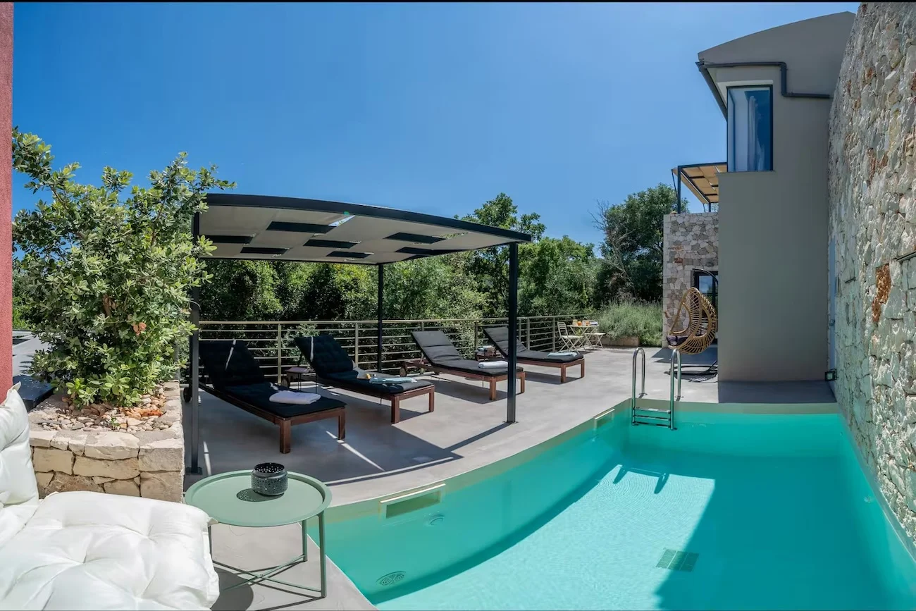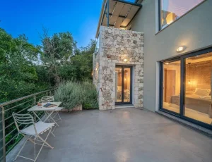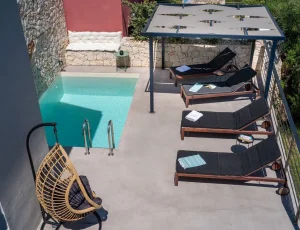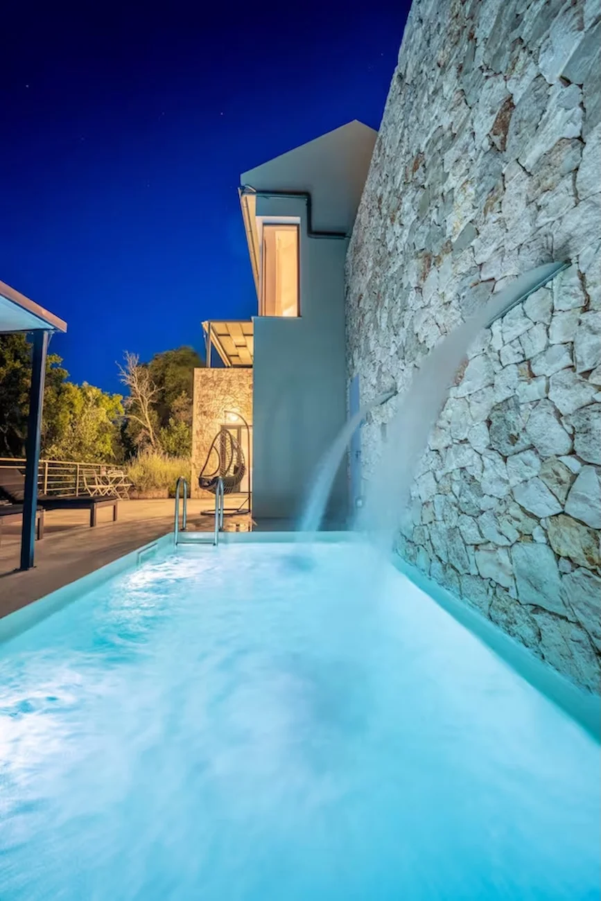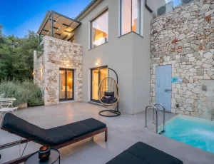 Villa Nikolas is a high-quality private villa with a saltwater swimming pool, offering everything a discerning guest may desire for a perfect holiday. Fully equipped and thoughtfully designed, the villa accommodates up to four guests in two bedrooms. Only premium materials, furniture, fabrics, and finishes have been selected, creating a harmonious blend of modern comfort and traditional character across its two-level layout. Large windows and open-plan spaces allow abundant natural light throughout the day and create a warm, atmospheric setting in the evening.