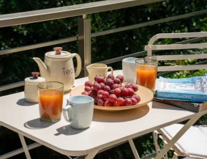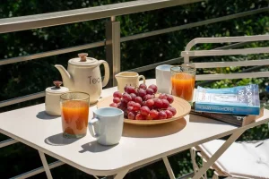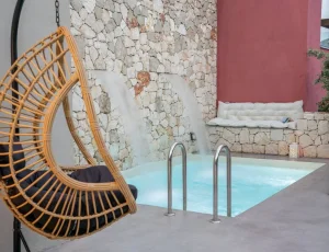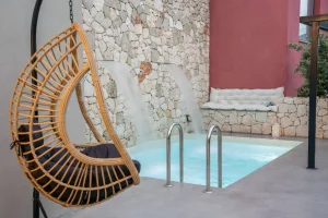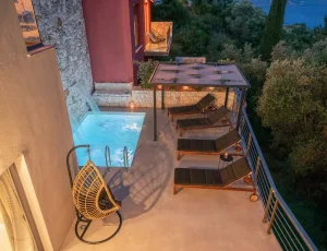 On the ground floor, guests will find the living room, a fully equipped kitchen, a WC, and direct access to an open terrace. A few steps lead down to the two bedrooms and an additional bathroom, offering enhanced privacy and tranquility. The saltwater pool is maintained using a salt chlorine generator system, which naturally converts salt into chlorine for a gentler and more environmentally friendly swimming experience. A BBQ area is also available, ideal for relaxed outdoor dining.