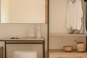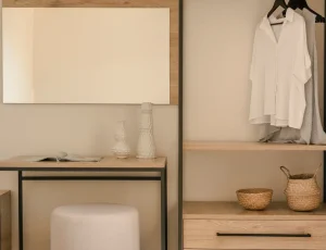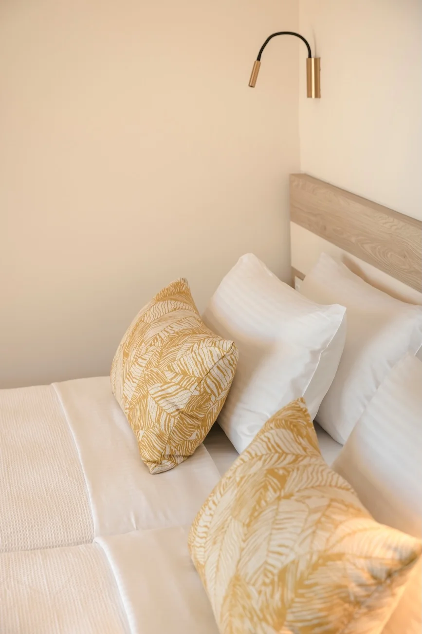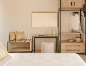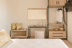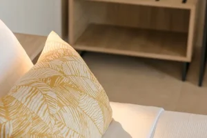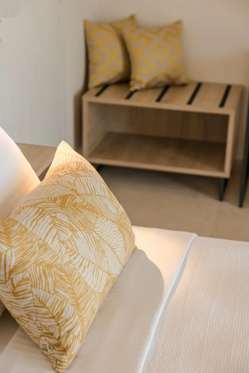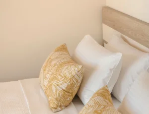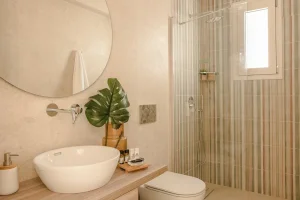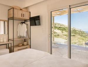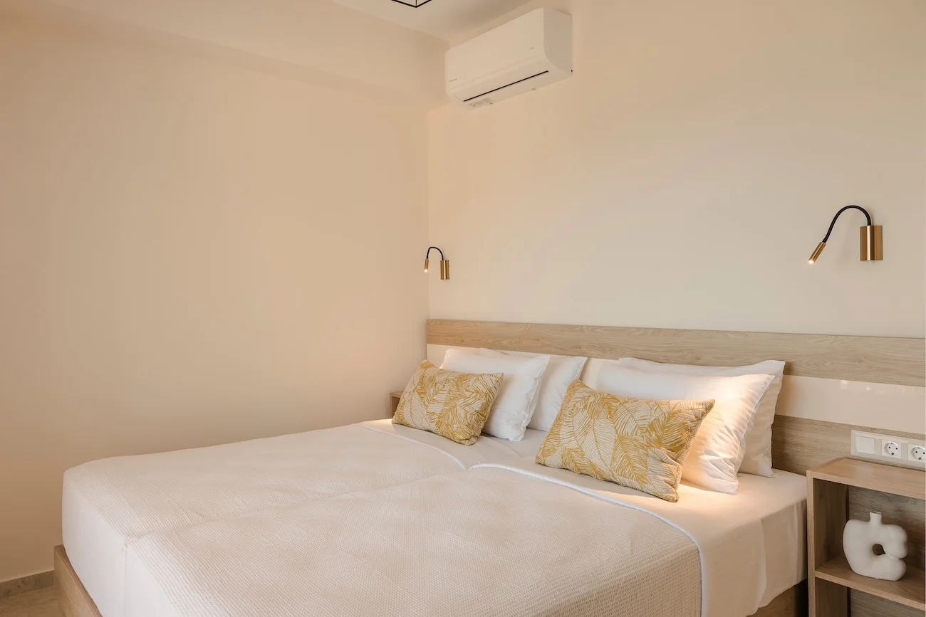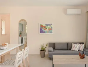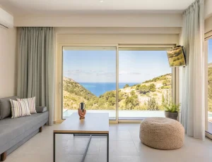 Both bedrooms have sea views, comfortable beds (each room has two single beds that can be attached to make doubles), natural wooden furniture, electric blinds and air conditioning. One bedroom has an en-suite bathroom. The other bedroom has a next door bathroom. Bathrooms have rainfall showers.