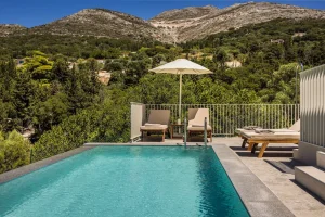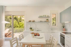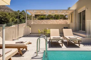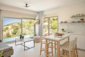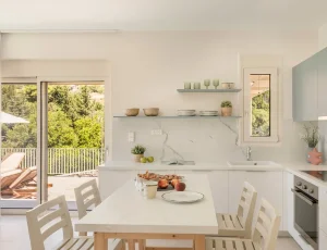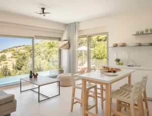 The kitchen and dining room is open plan, with a fully fitted kitchen and indoor dining table and chairs, and features large patio windows opening onto a large outdoor dining and lounging area with comfortable and modern furniture, a private infinity pool and a sun terrace with natural wooden sunbeds.