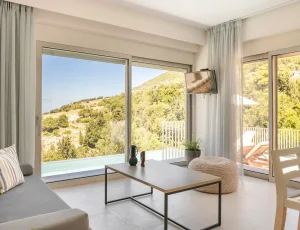 The surrounding area is a cosmopolitan resort and the touristic infrastructure improves every year. Built on the slopes of a mountain in northern Kefalonia, the village is surrounded by lush vegetation and has beautiful mountain views.