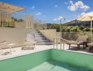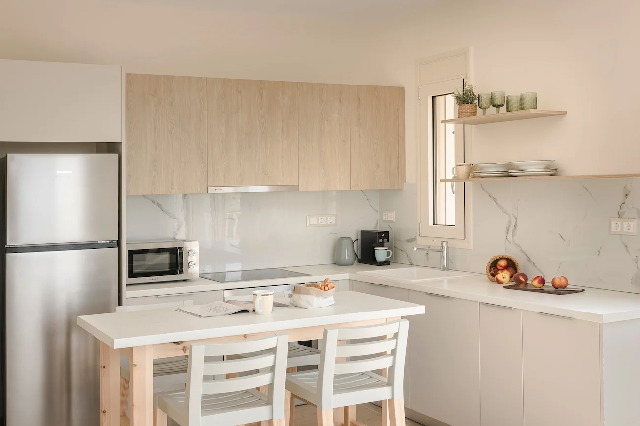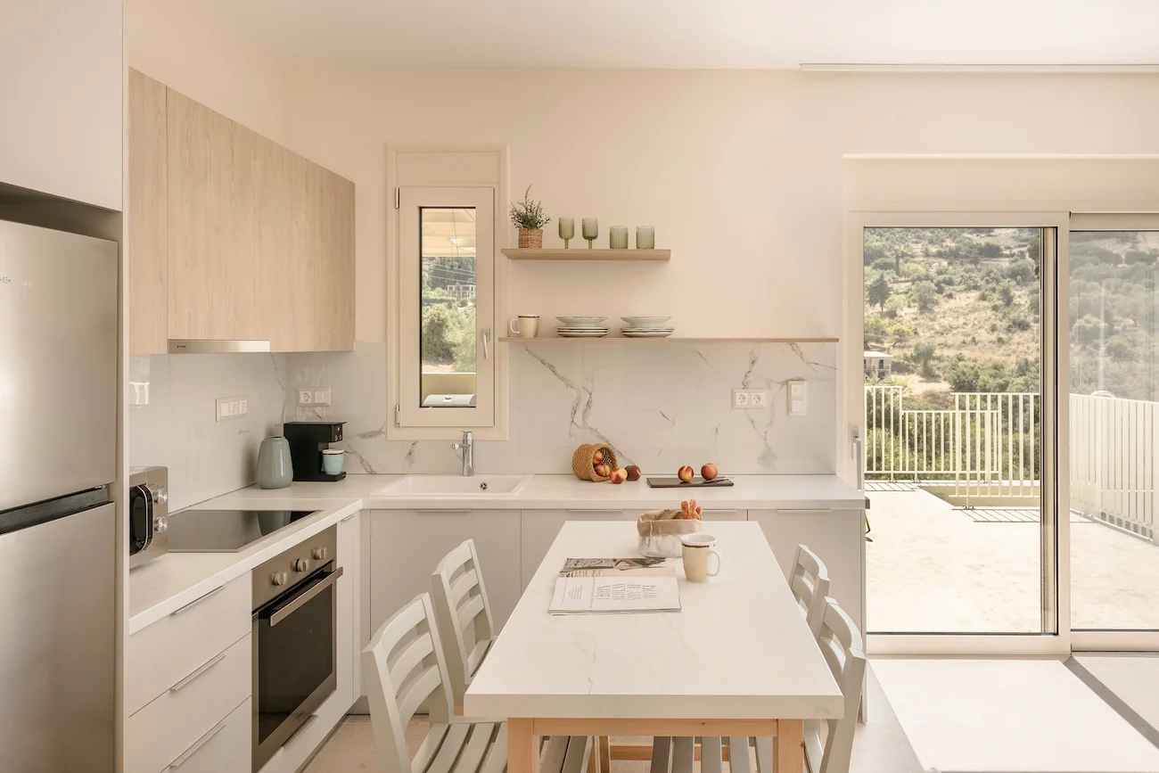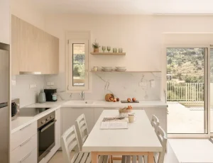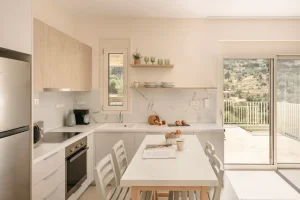 The kitchen and dining room is open plan, with a fully fitted kitchen and indoor dining table and chairs, and features large patio windows opening onto a large outdoor dining and lounging area with comfortable and modern furniture, a private infinity pool and a sun terrace with natural wooden sunbeds.