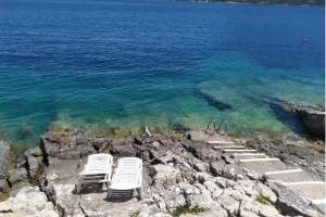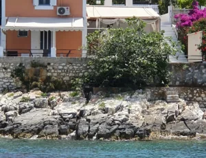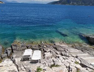 Uniquely situated at the waters edge, Efi’s Cottage is a captivating and relaxing for a holiday! Stone steps lead from the terrace door directly the sea – you are literally a stone’s throw from enjoying the crystal clear waters in almost total privacy! At the edge of the village the cottage provides tranquility yet is still within walking distance of Fiscardo’s centre. The waterfront location provides an extensive view of Fiscardo, its lighthouse and the famous neighboring island of Ithaca. This traditional, cosy cottage is ideal for a romantic holiday for two! Offering privacy and a stunning terrace perched right on the edge of the sea. The cottage consists of two floors. On the top floor there is a light and airy bedroom furnished with a super-sized king bed (which can be transformed into two single beds), large wardrobe and dressing table, air conditioning, a flat screen TV/DVD and two comfortable armchairs. There are two windows, sea view, to let in the sea breeze, or you may prefer the air conditioning! Downstairs there is a small kitchen and bathroom. The kitchen provides adequate facilities for self-catering. It comes with an electric oven, refrigerator, cooking utensils, pots, pans, kitchenware and flatware, a coffee maker, microwave and toaster. The bathroom has a wc, sink and shower. Weekly cleaning and linen change is carried out, but should you require complete privacy extra linen is provided for your stay, as well as beach towels. The kitchen leads onto two spacious terraces: the first is equipped with a barbecue grill, and a large dining table and chairs so you can enjoy your meals with the amazing view, and at nighttime enjoy the stars! The second terrace provides a lounge area with 2 sunbeds and a sofa for sunbathing, outdoor curtains ensure total privacy! There are also two sunbeds down on the rocks for waterside sunbathing. On-road parking available. The cottage is located at the edge of the village, under a kilometer away from the centre of Fiscardo. It is a quiet, private and traditional area surrounded by nature, complete with picture postcard cats!