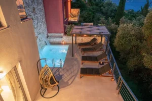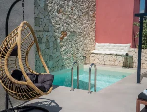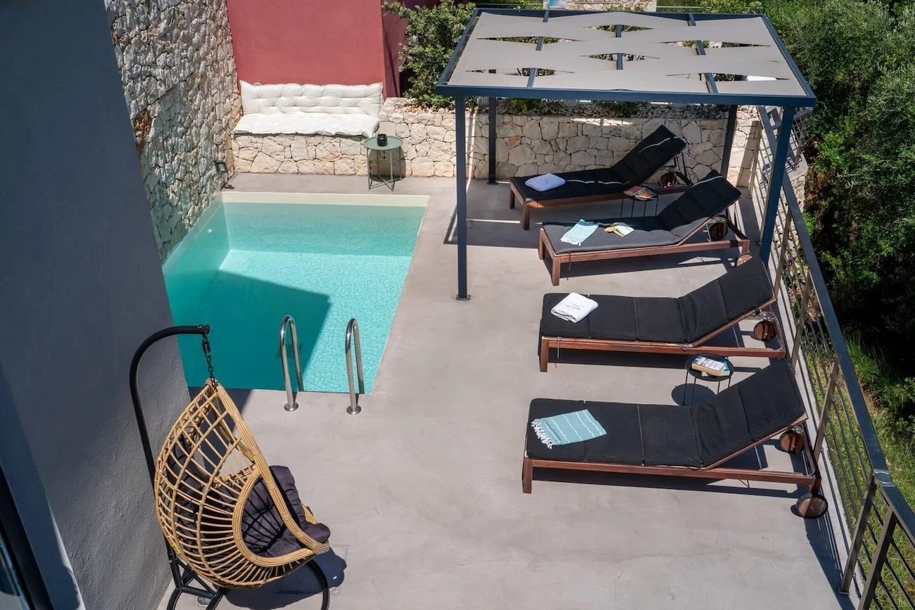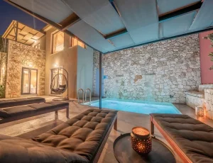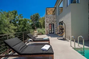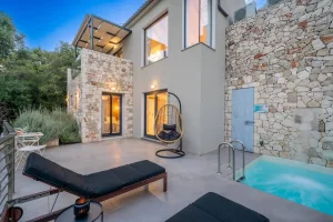 Villa Nikolas is a high-quality private villa with a saltwater swimming pool, offering everything a discerning guest may desire for a perfect holiday. Fully equipped and thoughtfully designed, the villa accommodates up to four guests in two bedrooms. Only premium materials, furniture, fabrics, and finishes have been selected, creating a harmonious blend of modern comfort and traditional character across its two-level layout. Large windows and open-plan spaces allow abundant natural light throughout the day and create a warm, atmospheric setting in the evening.