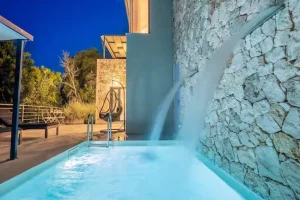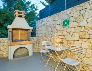 On the ground floor, guests will find the living room, a fully equipped kitchen, a WC, and direct access to an open terrace. A few steps lead down to the two bedrooms and an additional bathroom, offering enhanced privacy and tranquility. The saltwater pool is maintained using a salt chlorine generator system, which naturally converts salt into chlorine for a gentler and more environmentally friendly swimming experience. A BBQ area is also available, ideal for relaxed outdoor dining.