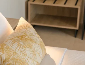 Both bedrooms have sea views, comfortable beds (each room has two single beds that can be attached to make doubles), natural wooden furniture, electric blinds and air conditioning. One bedroom has an en-suite bathroom. The other bedroom has a next door bathroom. Bathrooms have rainfall showers.